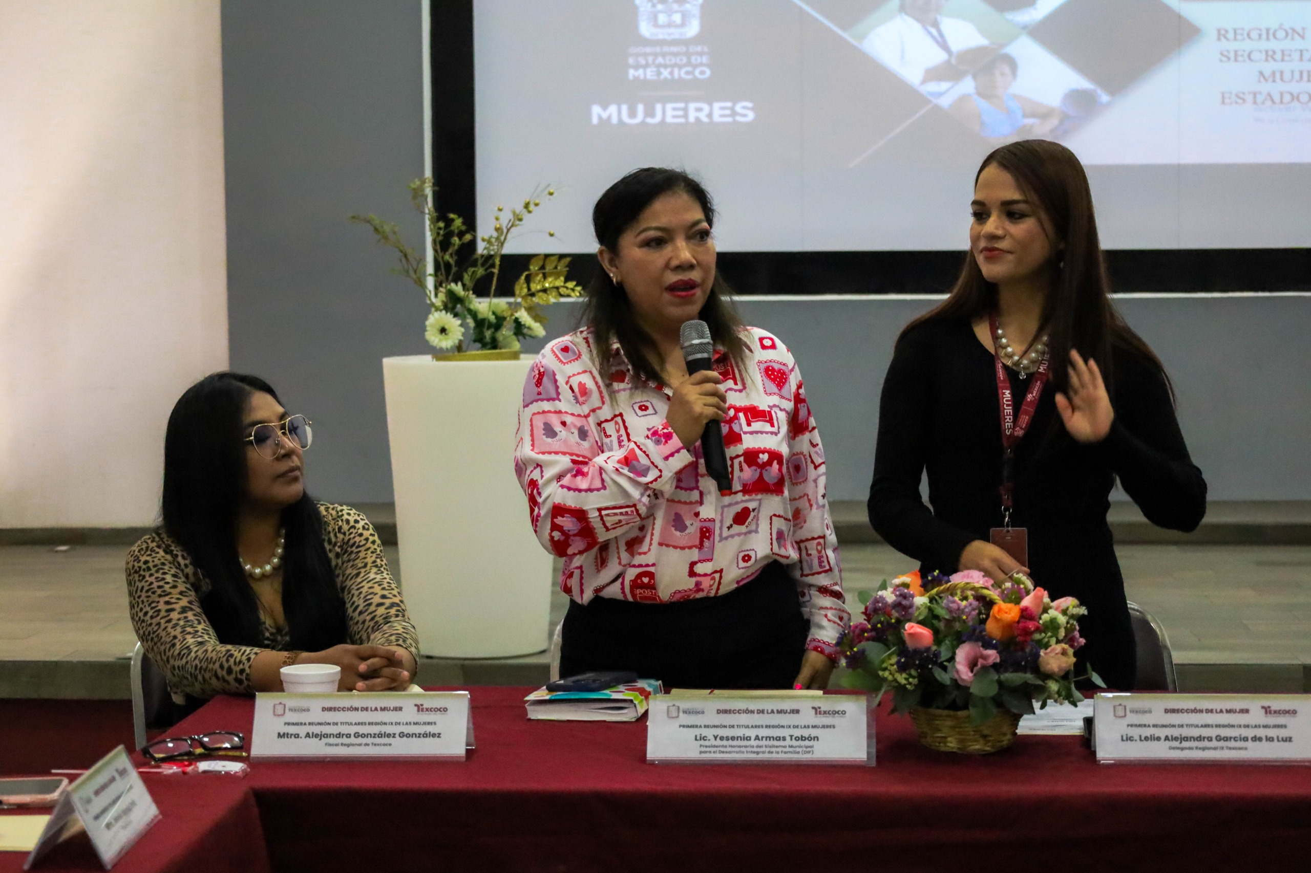 La Presidenta del Sistema Municipal para el Desarrollo Integral de la Familia (DIF) de Texcoco, fue la encargada de dar la bienvenida a la Delegada Regional de la Secretaría de la Mujer, Leslie Alejandra García dela Cruz, la Maestra Alejandra González González Fiscal de Texcoco, la Maestra Jennie Idania Ortiz Fiscal de trata y el Fiscal Regional de Texcoco Jesús Vladimir Sánchez Vega.