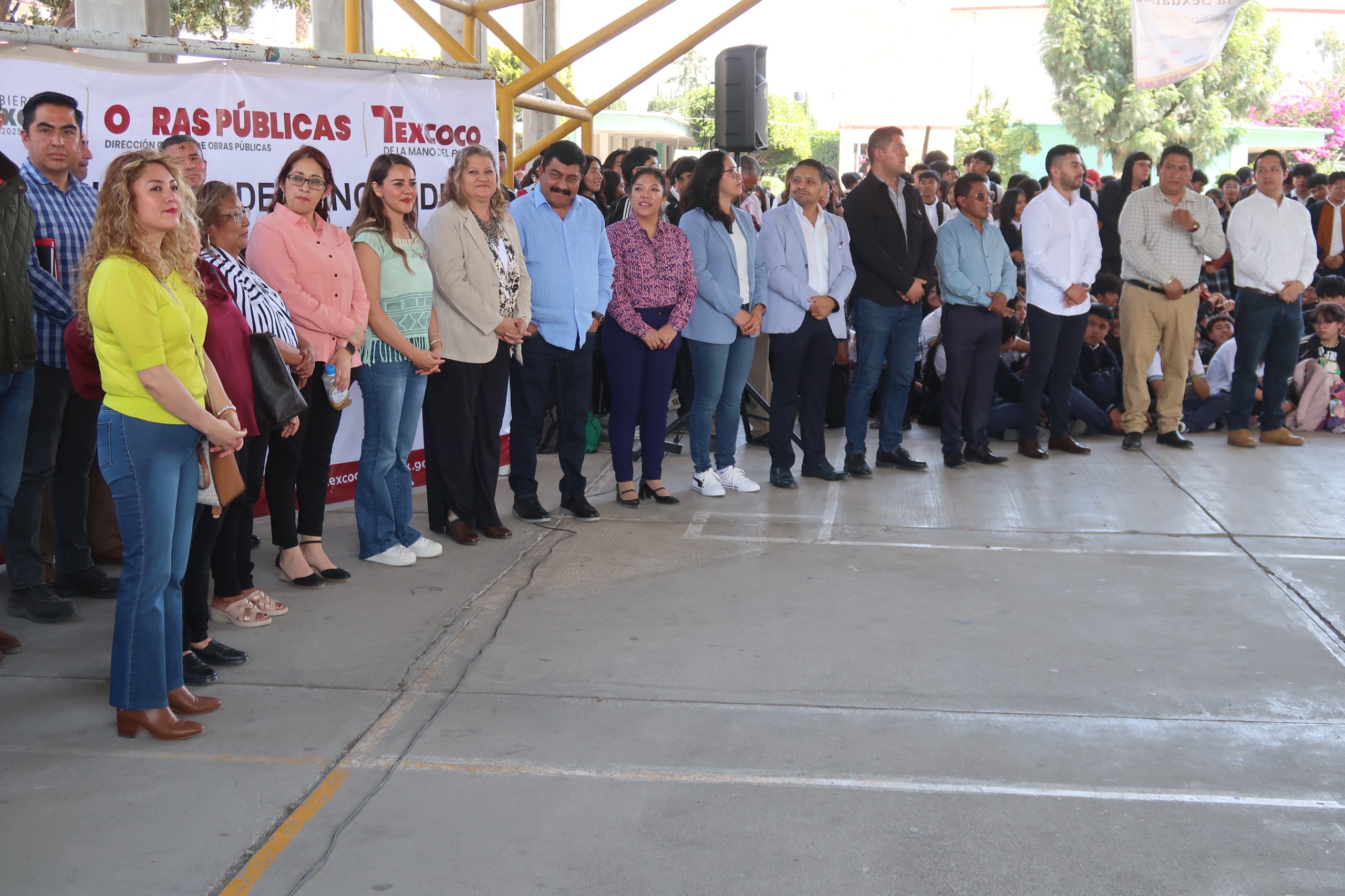 Ante estudiantes de los turnos matutino y vespertino, el Presidente Municipal Nazario Gutiérrez Martínez, acompañado por la Directora del plantel educativo Sol María Silva Vázquez, la Presidenta del Sistema Municipal para el Desarrollo Integral de la Familia (DIF)Texcoco, Yesenia Armas Tobón, así integrantes del cabildo directores de las diferentes áreas del gobierno municipal.