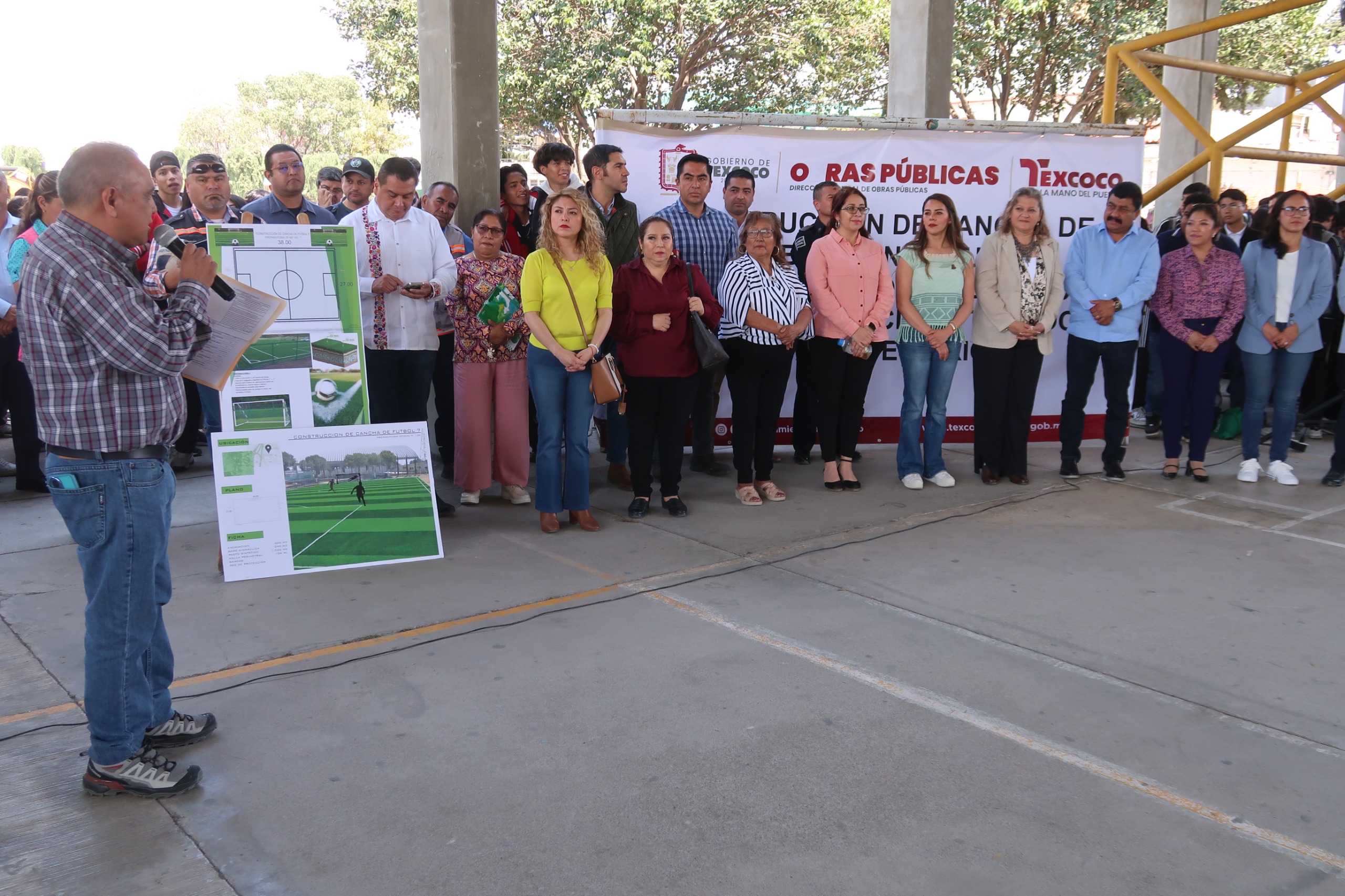 Con la finalidad de ofrecer a los jóvenes alternativas deportivas que les permita completar su educación, el Gobierno Municipal de Texcoco dió inicio a los trabajos de construcción de la cancha de fútbol 7, con una inversión aproximada de dos millones de pesos y anunció la desincorporación del predio de la Prepa 100, para darle certeza jurídica y que forme parte del patrimonio de este plantel de educación media superior.