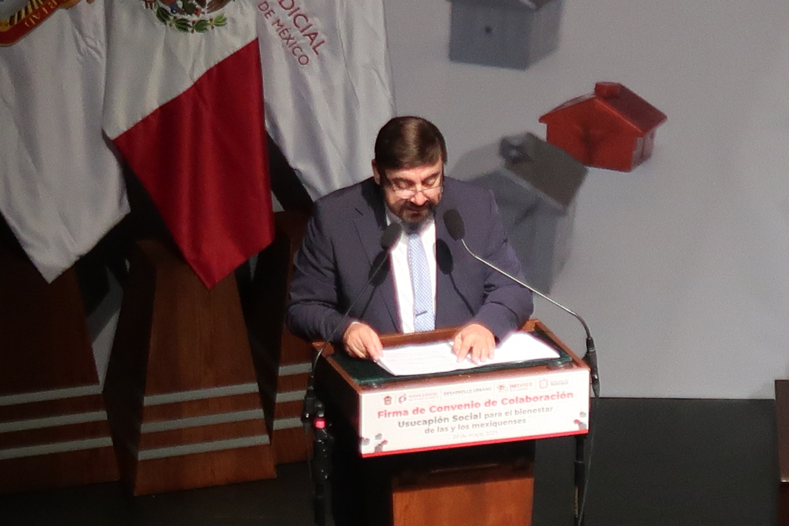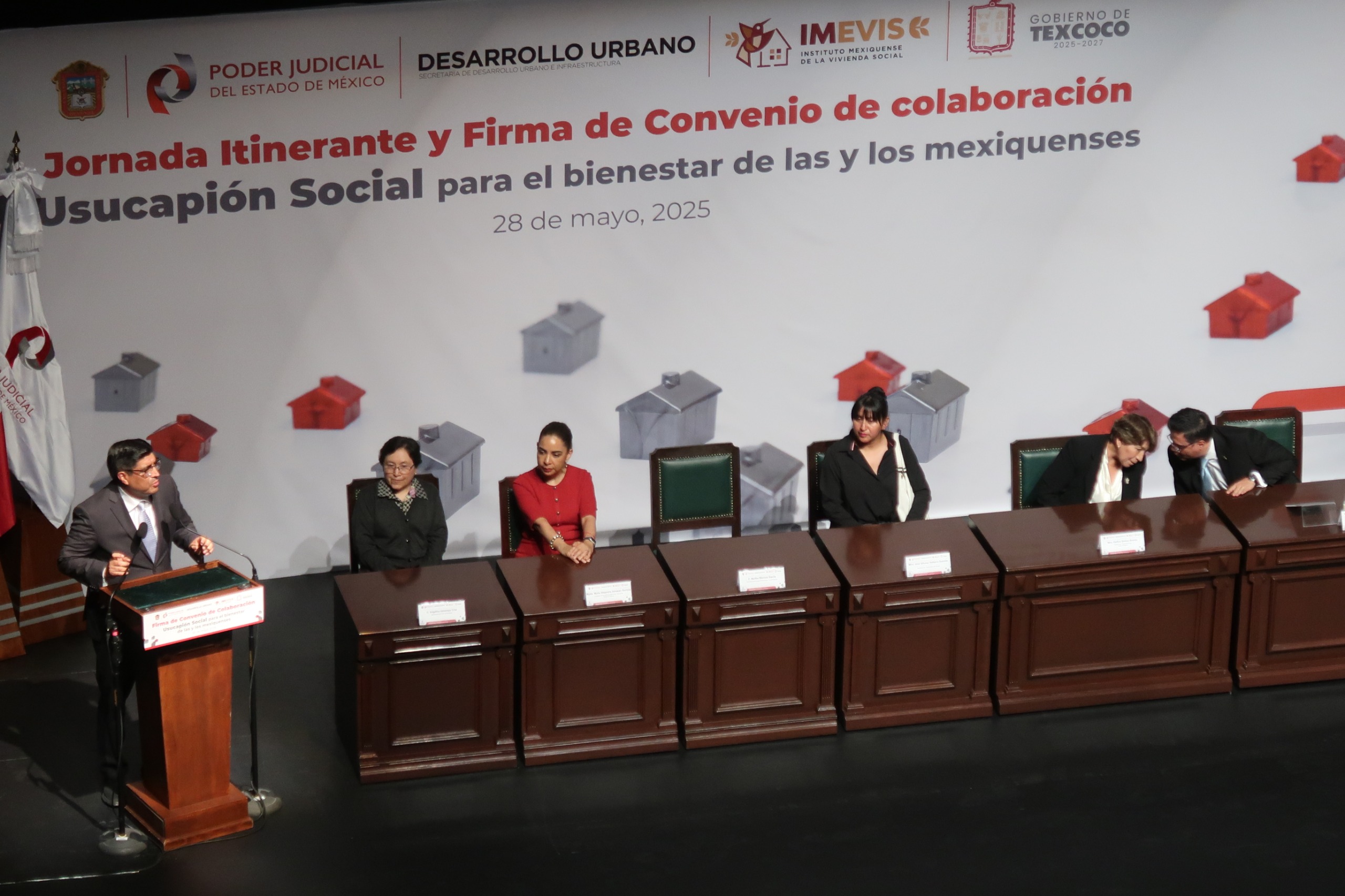 Durante la ceremonia el Gobierno del Estado de México y el Poder Judicial firmaron Convenio de Colaboración de Usucapión Social para el Bienestar de las y los Mexiquenses, con la finalidad de dar certeza jurídica patrimonial a miles de familias de esta entidad.